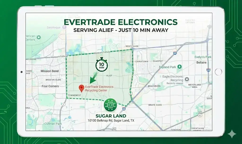 Looking for computer recycling near Alief? EverTrade Electronics is located just 10 minutes away in Sugar Land. We serve all Alief neighborhoods, businesses, and schools with free computer recycling and certified data destruction.